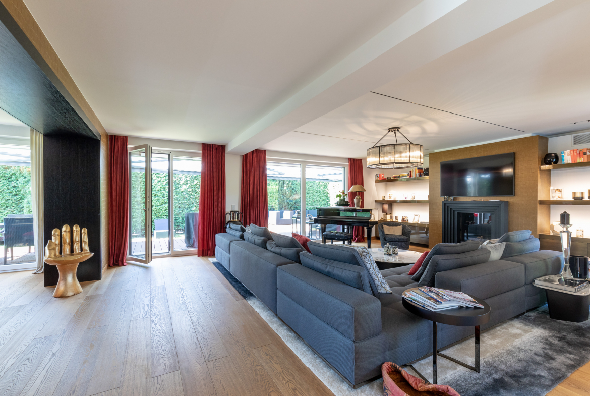 Ein ca. 60 m² großer Wohn-/Essbereich bildet das Zentrum des Hauses. Hier wurde ein elegantes Wandpanel mit Gaskamin und eingebauten Flatscreen-Fernseher sowie ein aufwendiges Beleuchtungskonzept installiert.